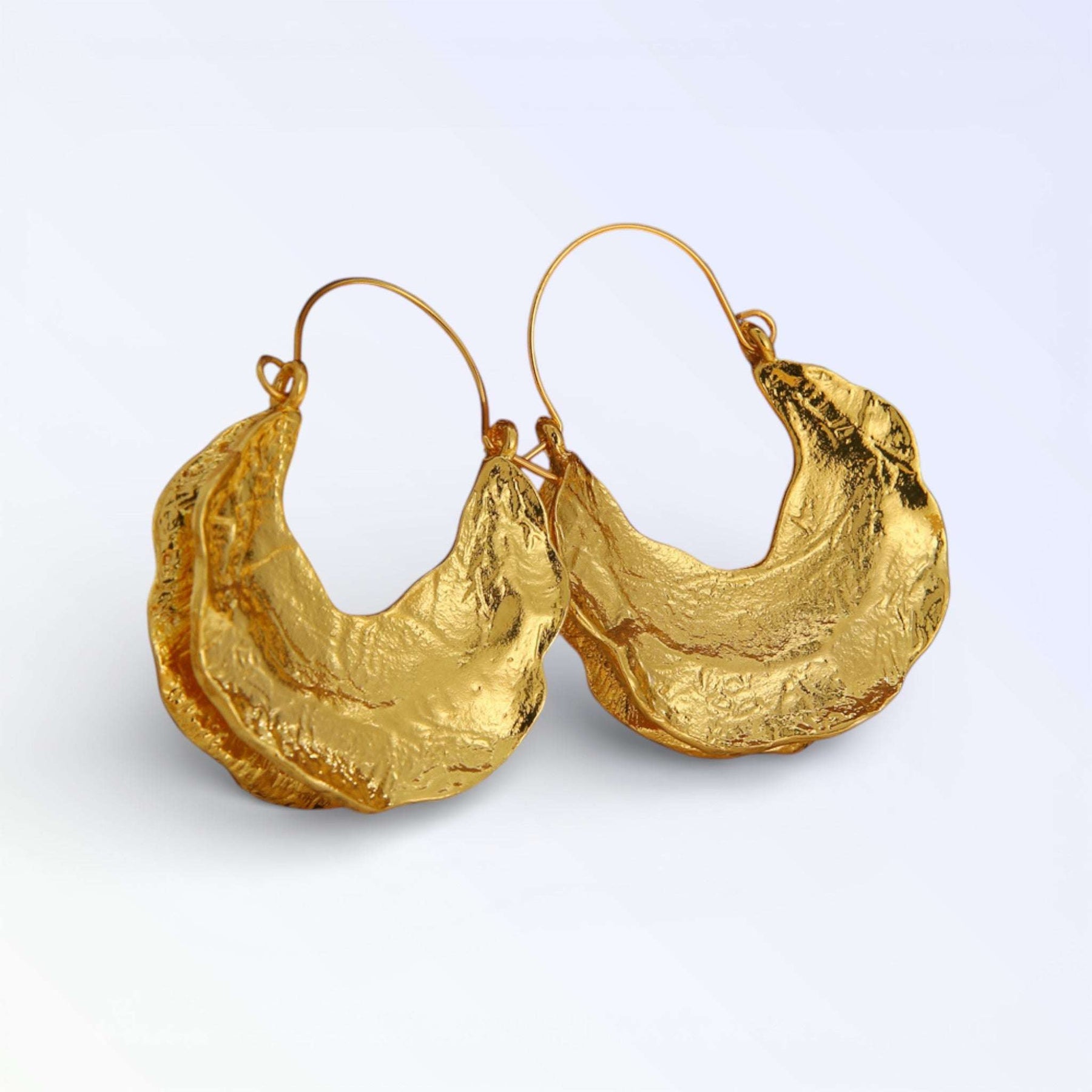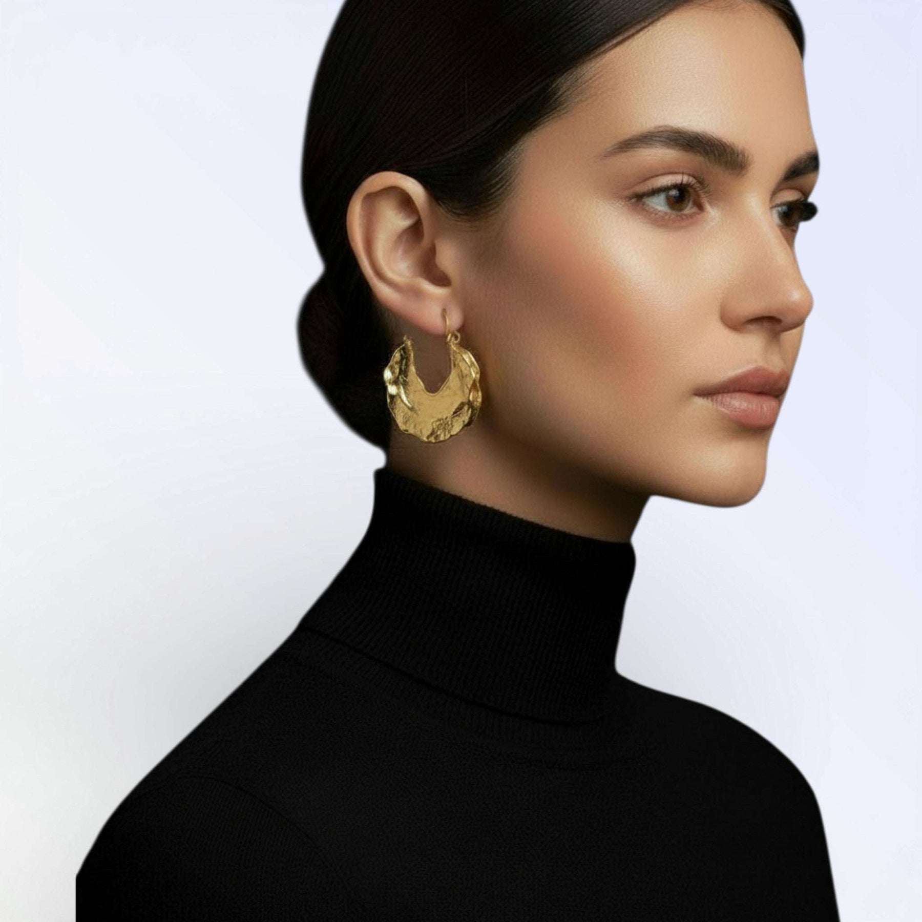 Realza tu estilo con estos impresionantes aros grandes de oro de 18 quilates, con un diseño único de media calabaza. Perfectos para quienes aprecian la fusión del encanto vintage con el diseño contemporáneo.