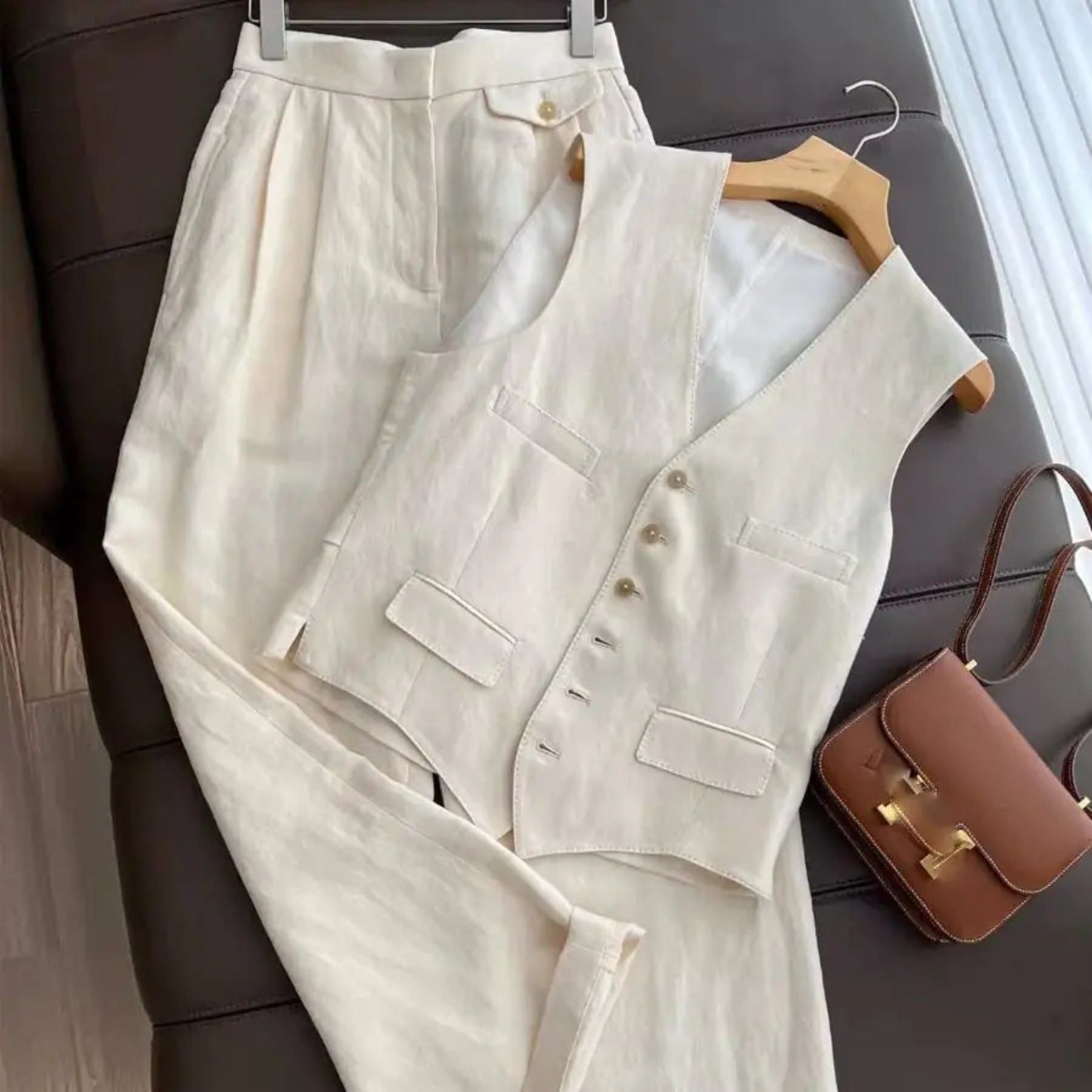 Este conjunto es la opción perfecta para quienes buscan un estilo chic para ir al trabajo, ideal tanto por la mañana como por la noche. La combinación de tejidos naturales garantiza comodidad y un aspecto impecable.
