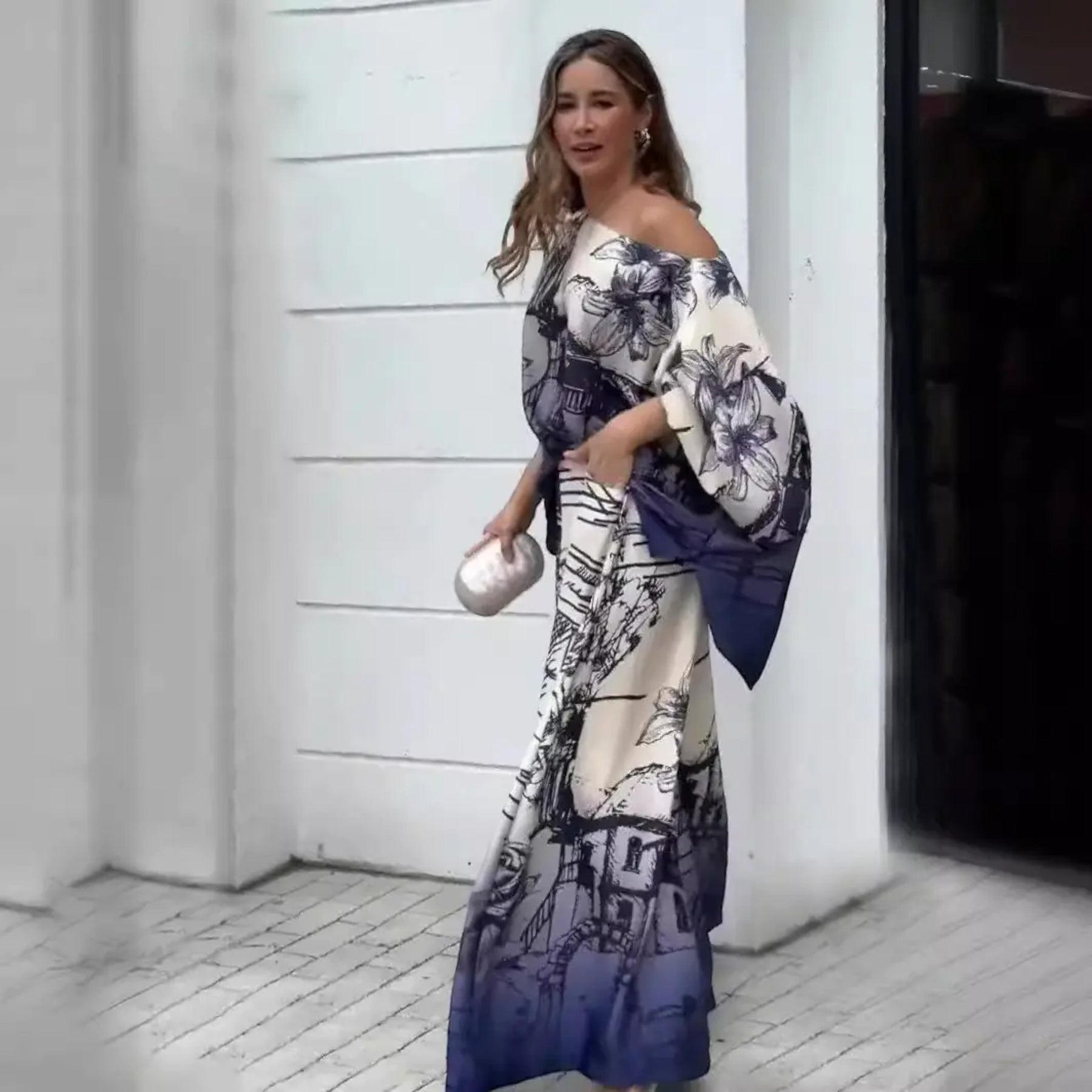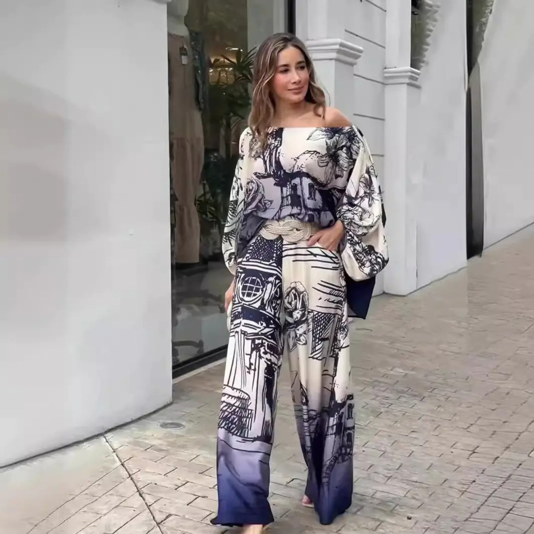 Elegancia premium en un diseño de dos piezas. Este conjunto incluye un top de manga murciélago y pantalones anchos que combinan tradición y modernidad.