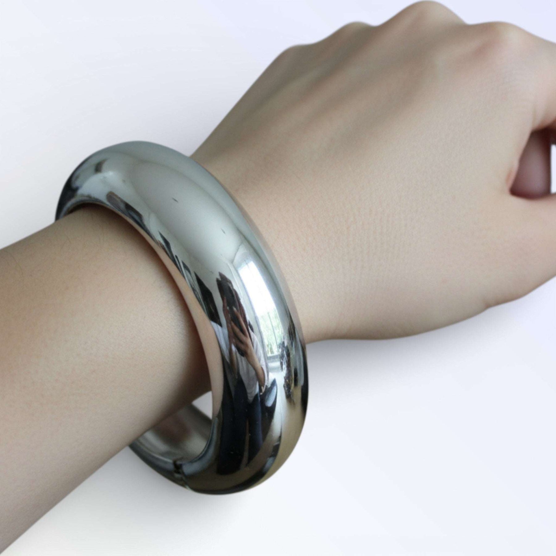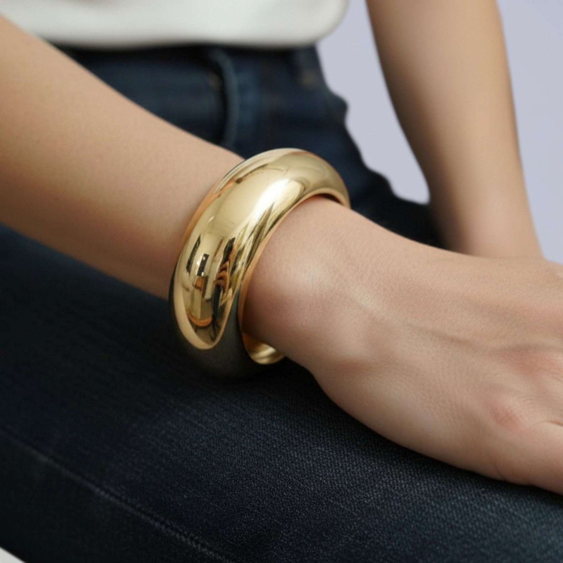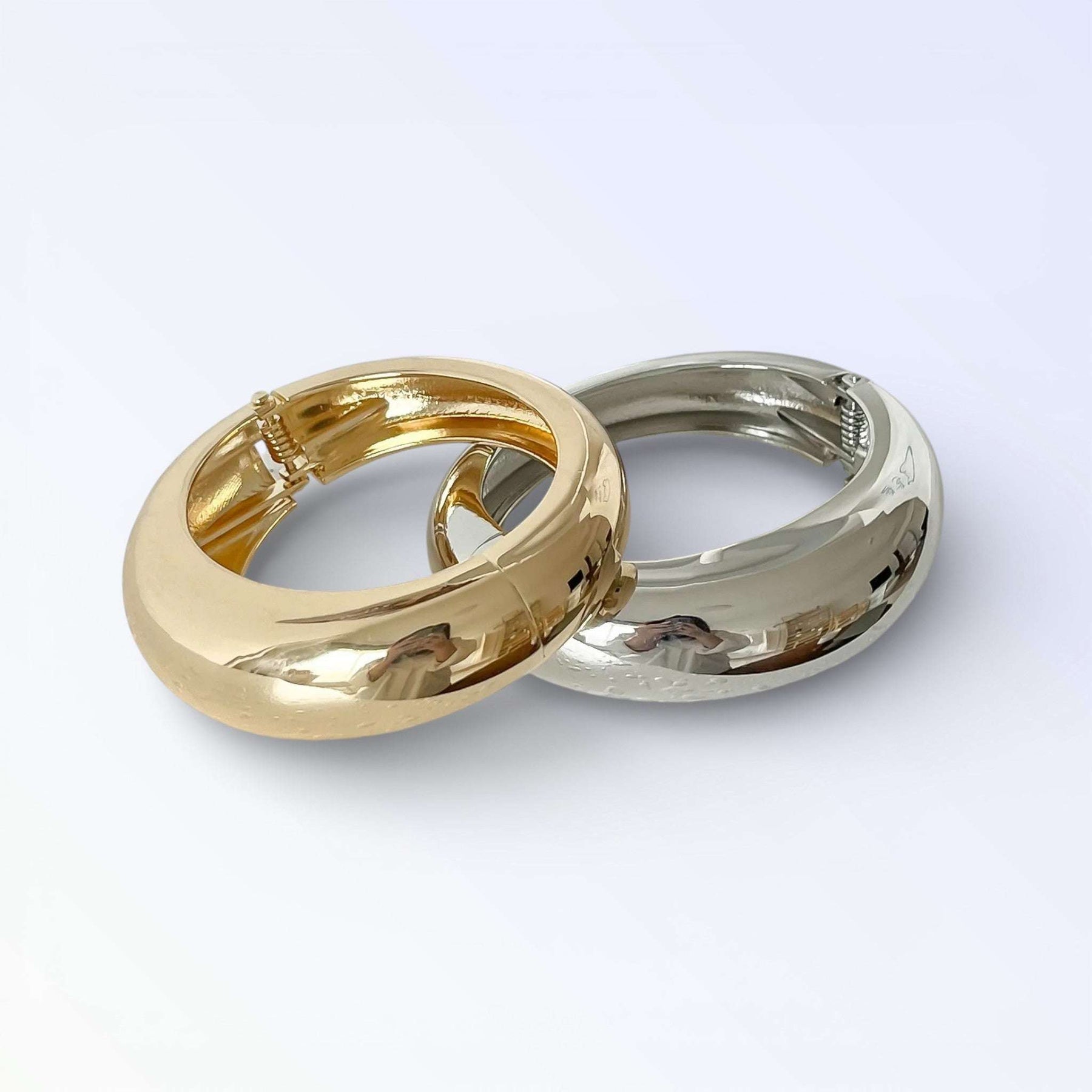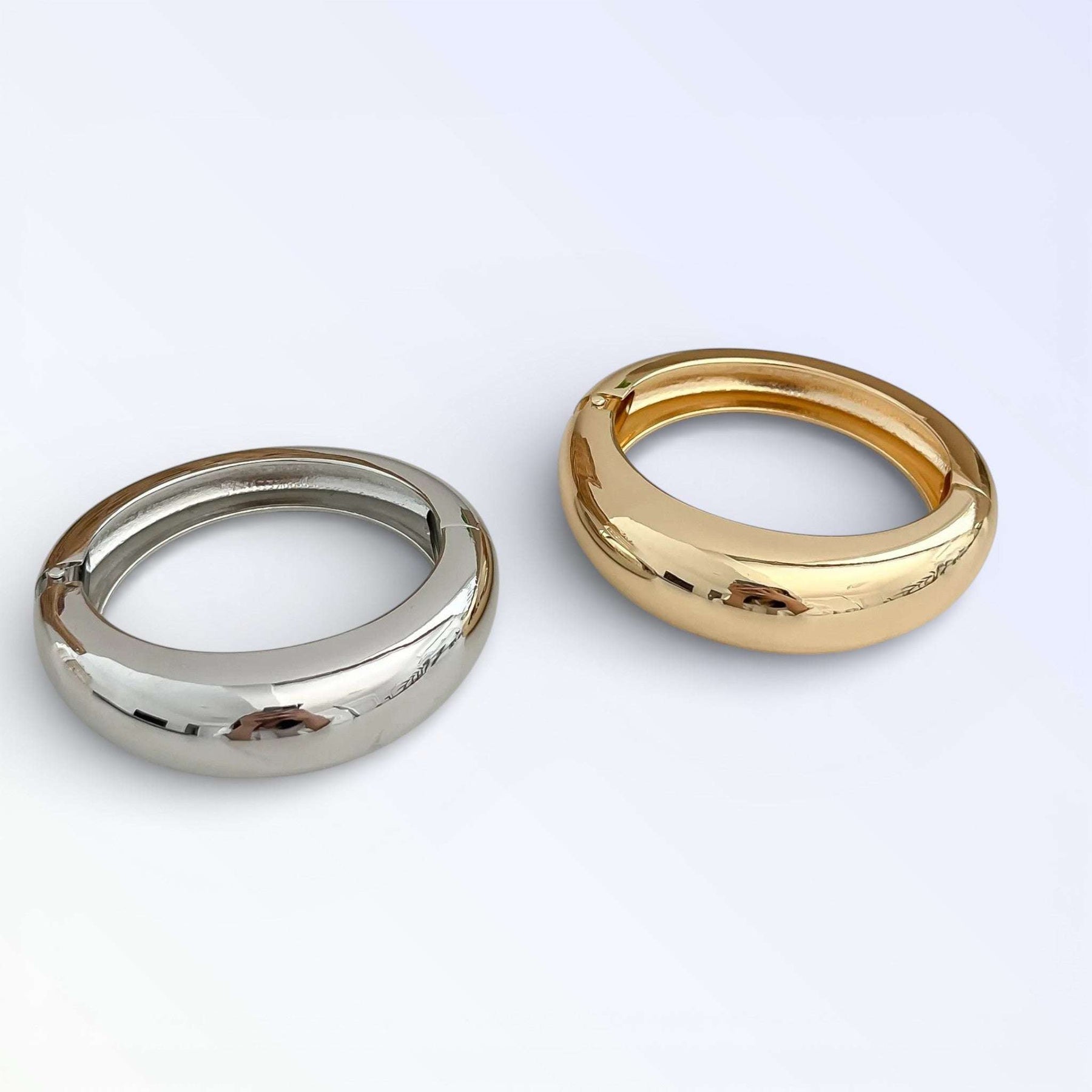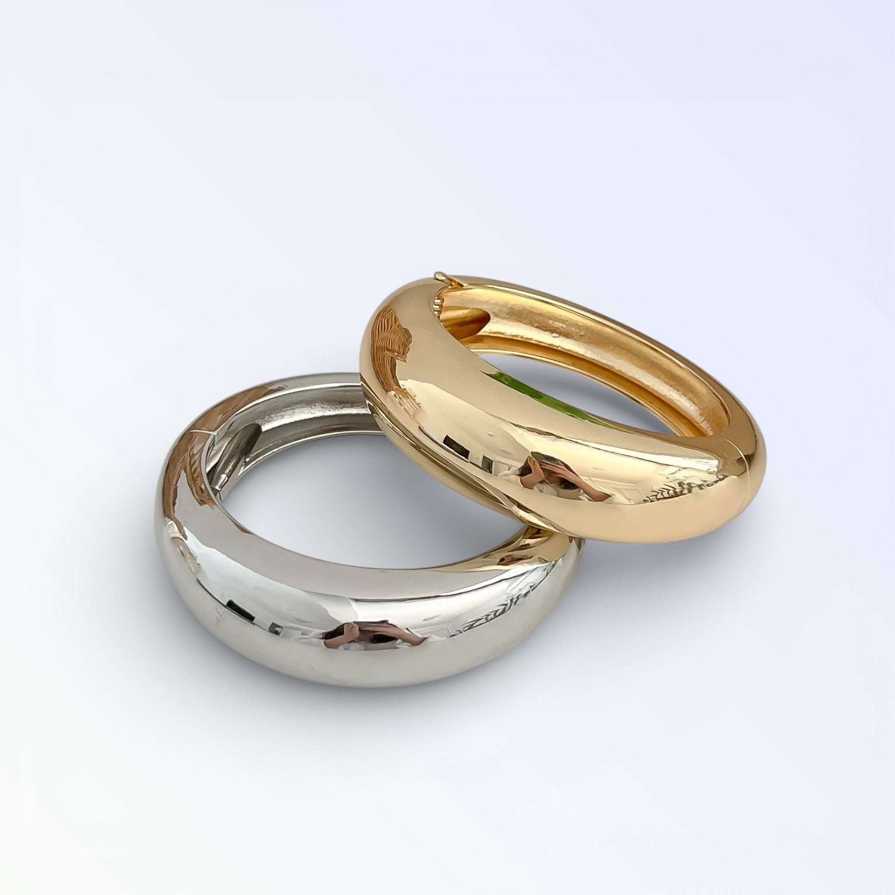 Dourado polido brilhante, diâmetro 7 cm, abertura flexível, ajuste universal.