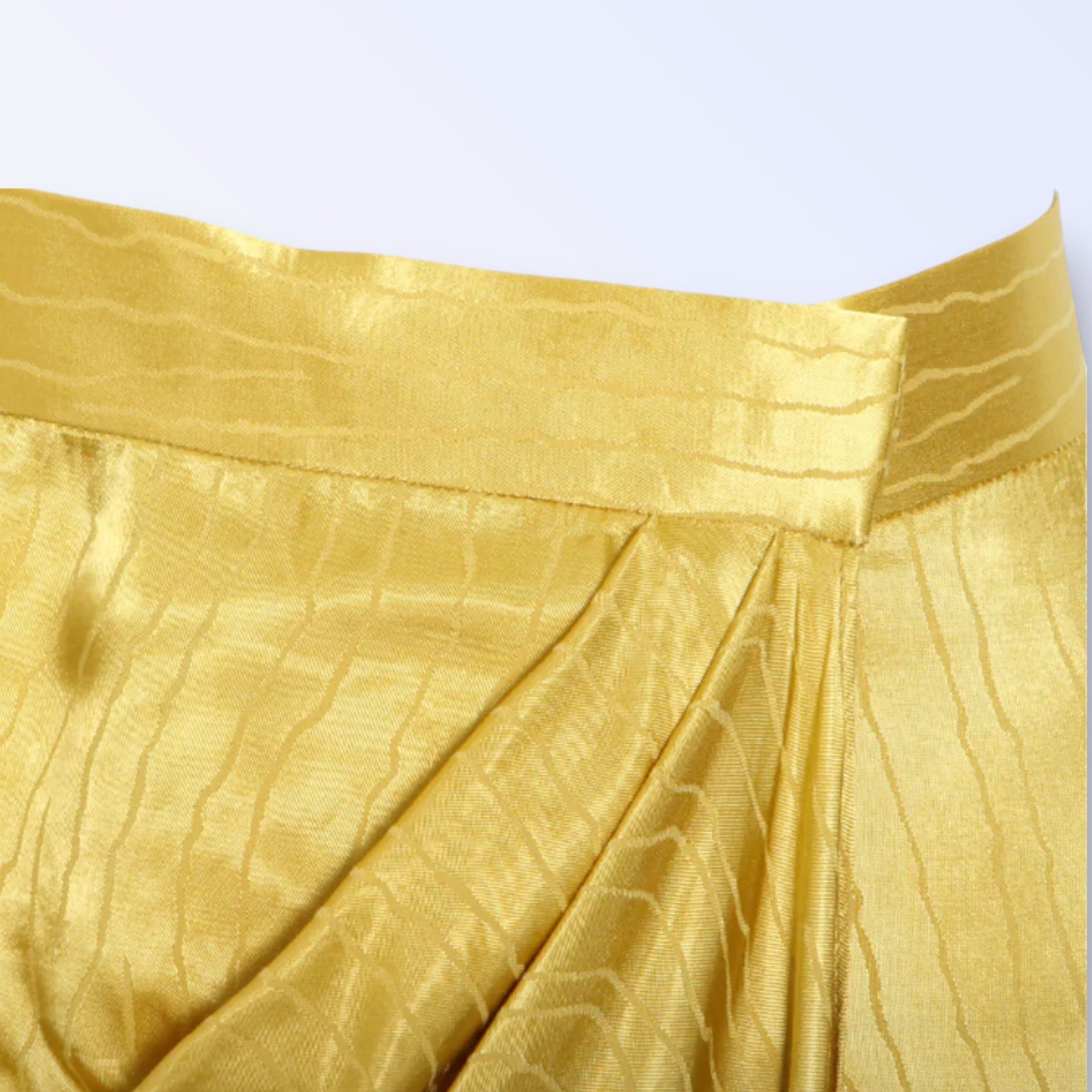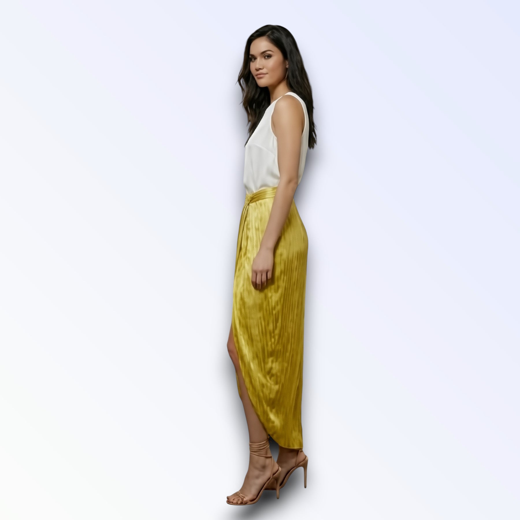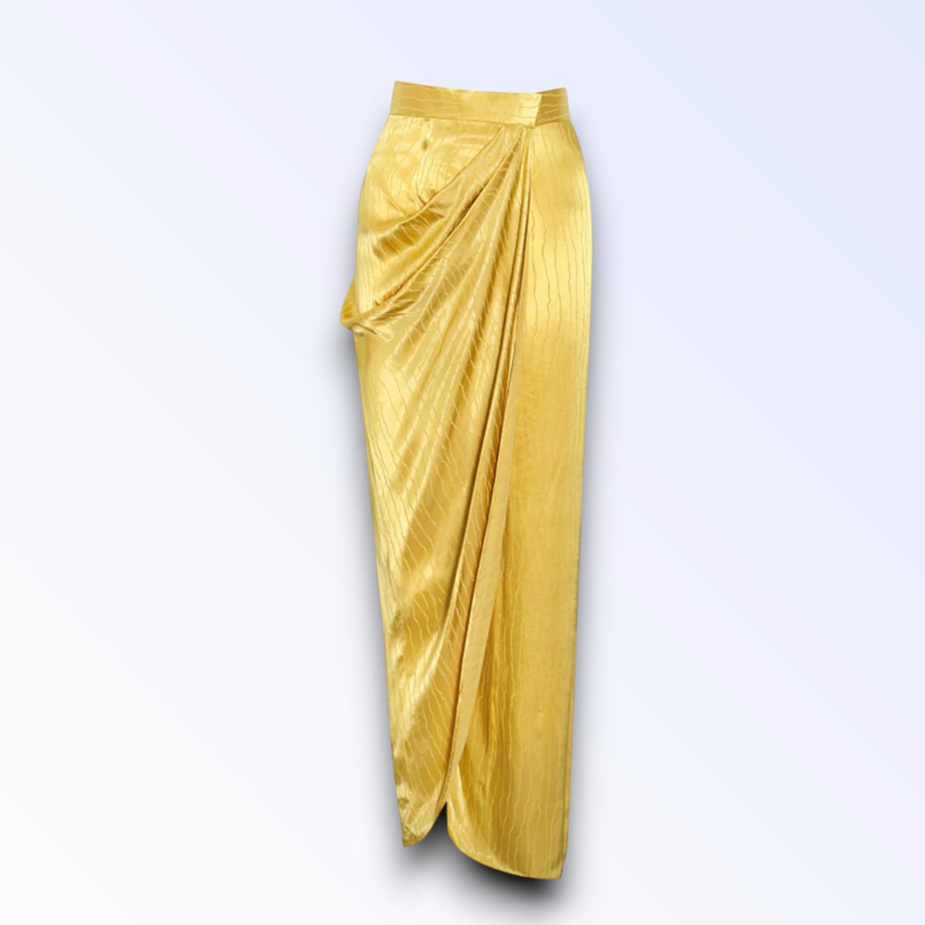 A ABISMO deslumbra com acetinado plissado que captura luz em pregas infinitas, amarração na cintura alta ajusta com graça para silhueta personalizada e fluida. Corte longo evasê cria movimento hipnótico, ideal para elevar tops impressos ou blusas da KUKA em ocasiões especiais ou saídas noturnas. Brilho rico e tacto sedoso fundem luxo a versatilidade quotidiana.