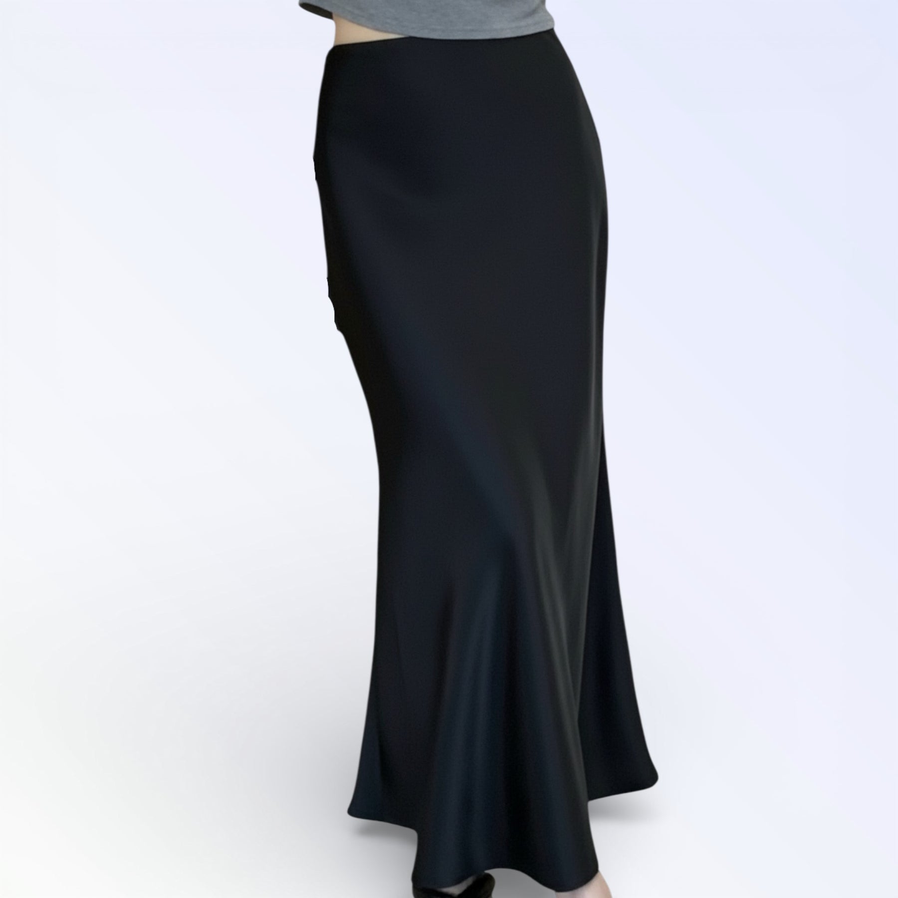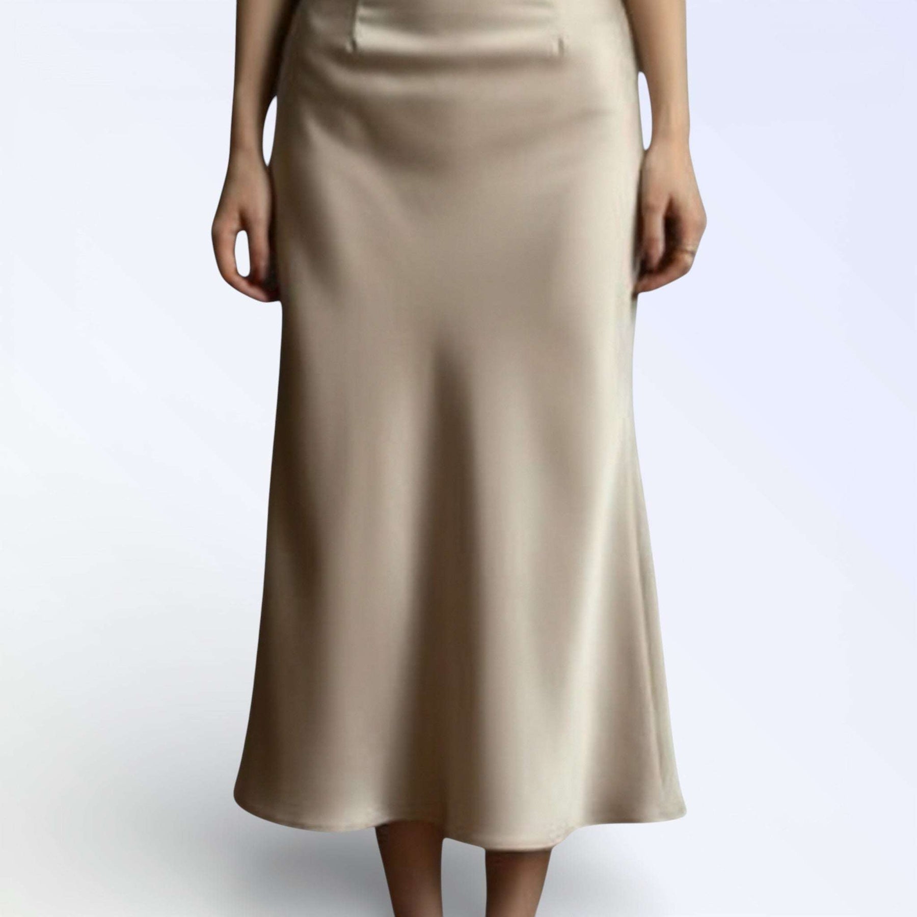 Tecido acetinado suave, corte evasê fluido, comprimento longo com drapeado natural.