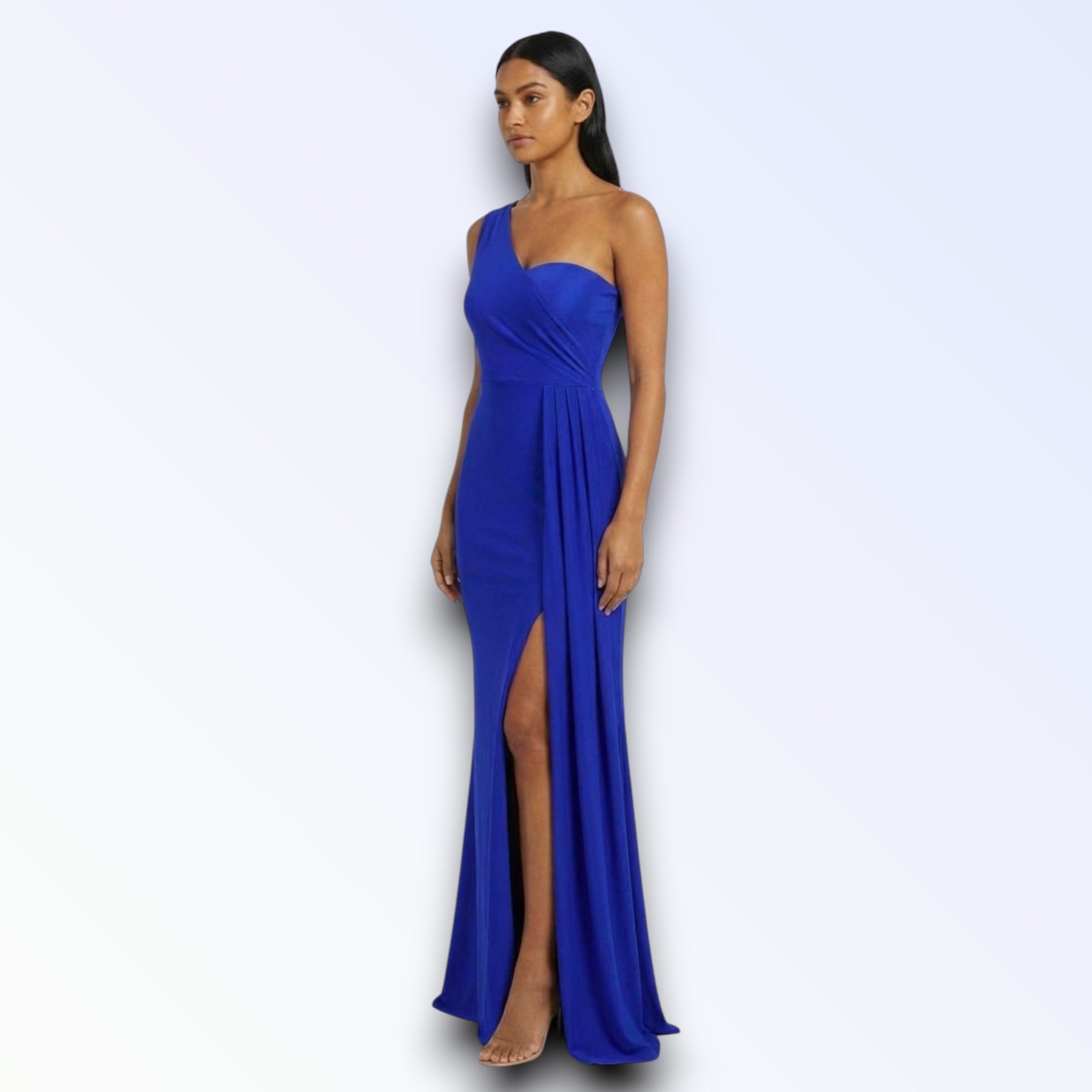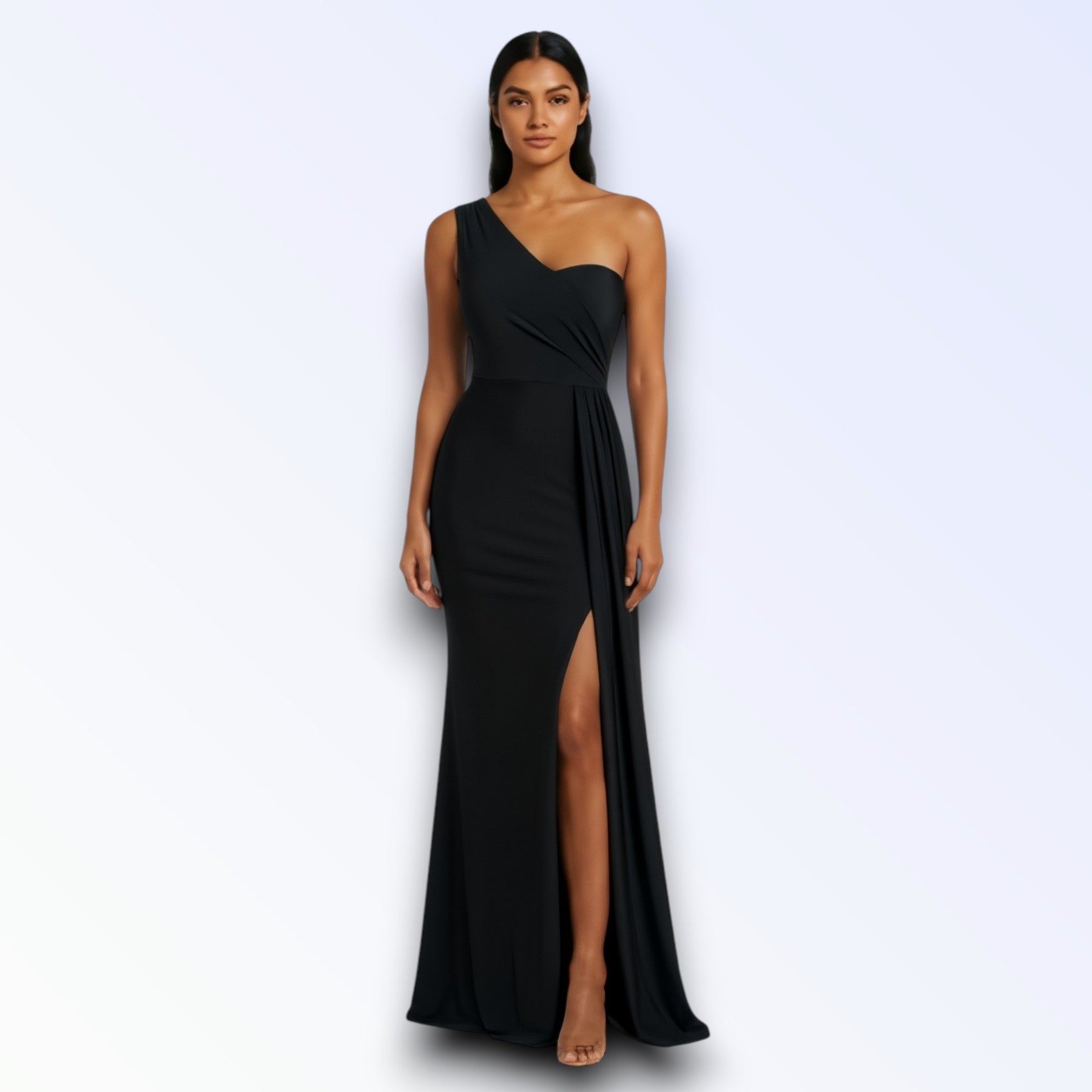 O D. CATARINA fascina com ombro único drapeado que cria assimetria sensual, fenda alta lateral revela passo confiante em saia longa fluida com cauda dramática. Torso justo elástico abraça curvas, silhueta sereia alongada perfeita para saltos da KUKA em red carpets ou galas. Movimento hipnótico une ousadia a graça absoluta.