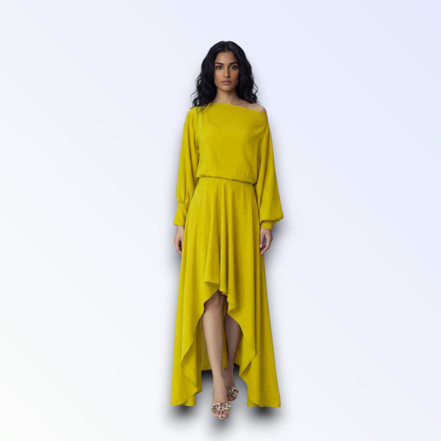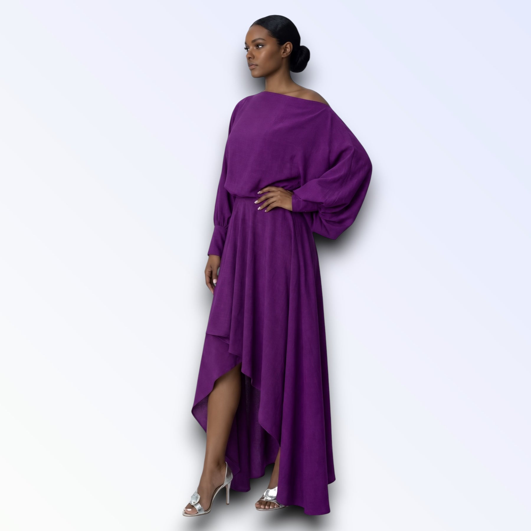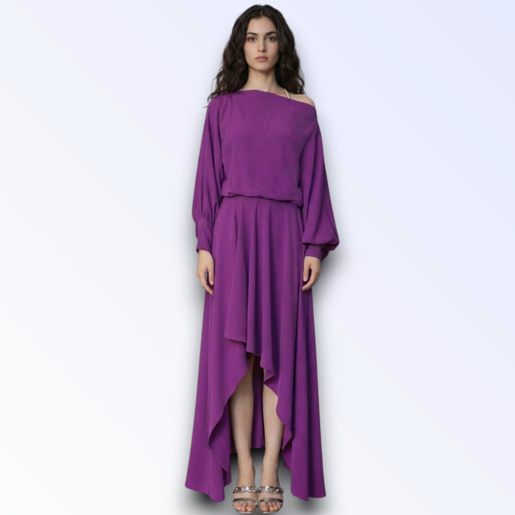 Tecido fluido leve, mangas oversized godê longas, torso solto, saia longa assimétrica cauda irregular.