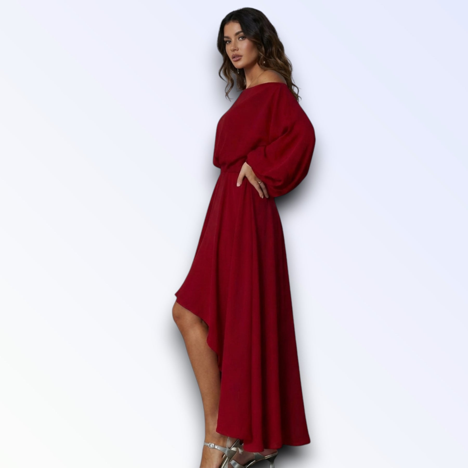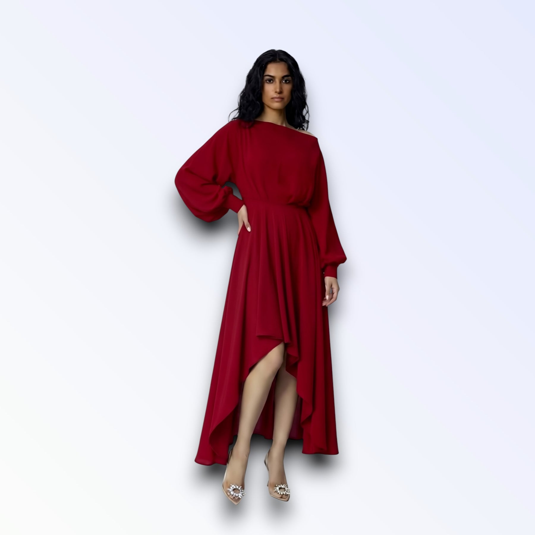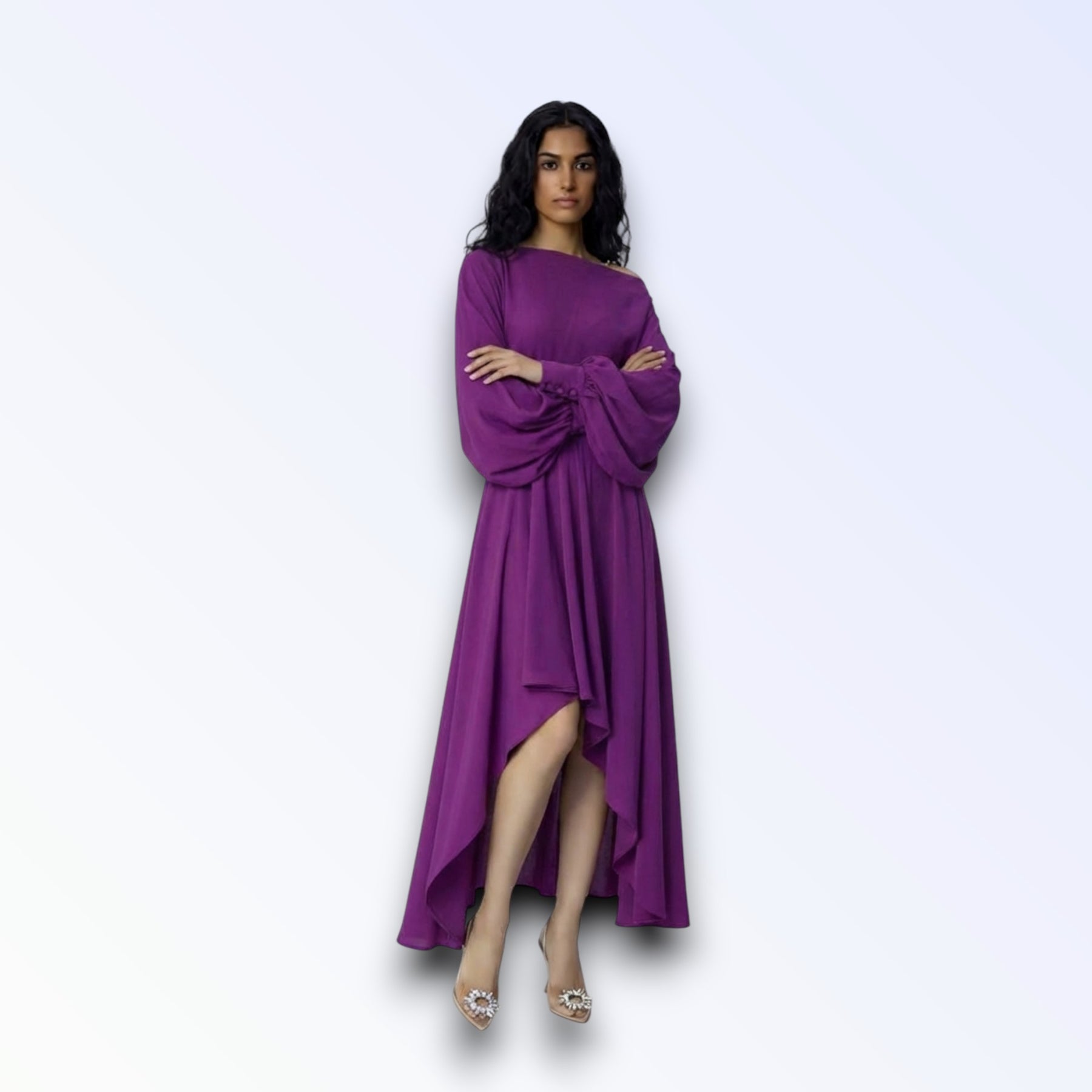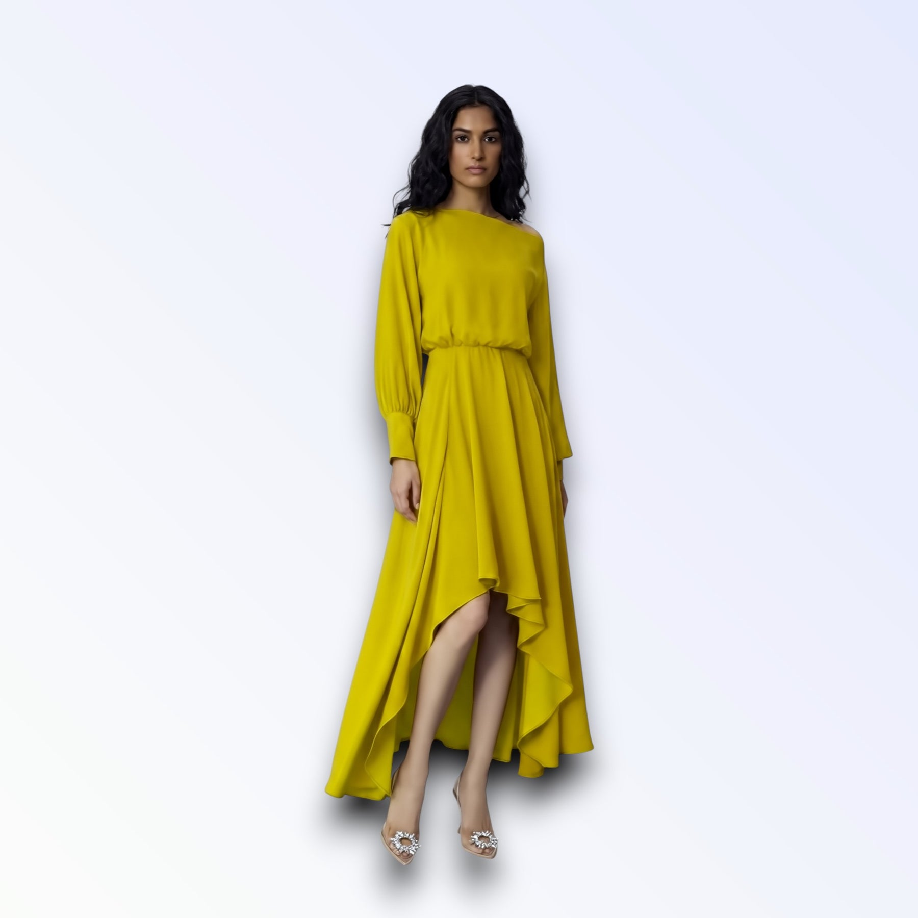 Tecido fluido leve, mangas oversized godê longas, torso solto, saia longa assimétrica cauda irregular.