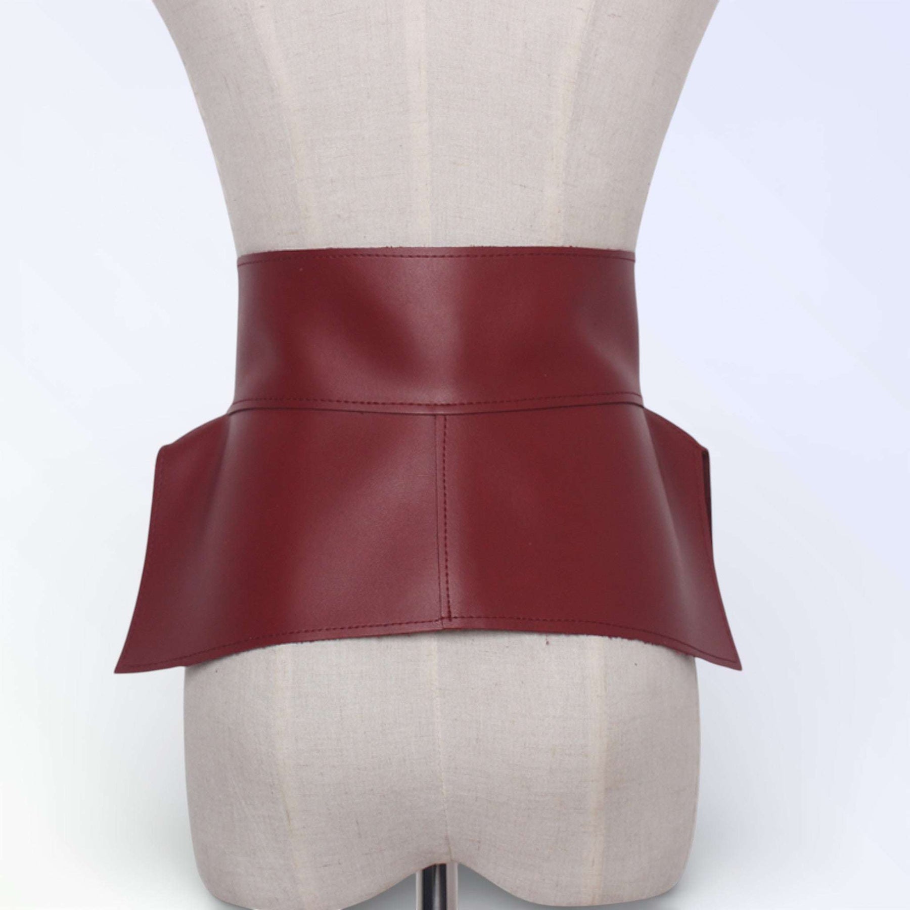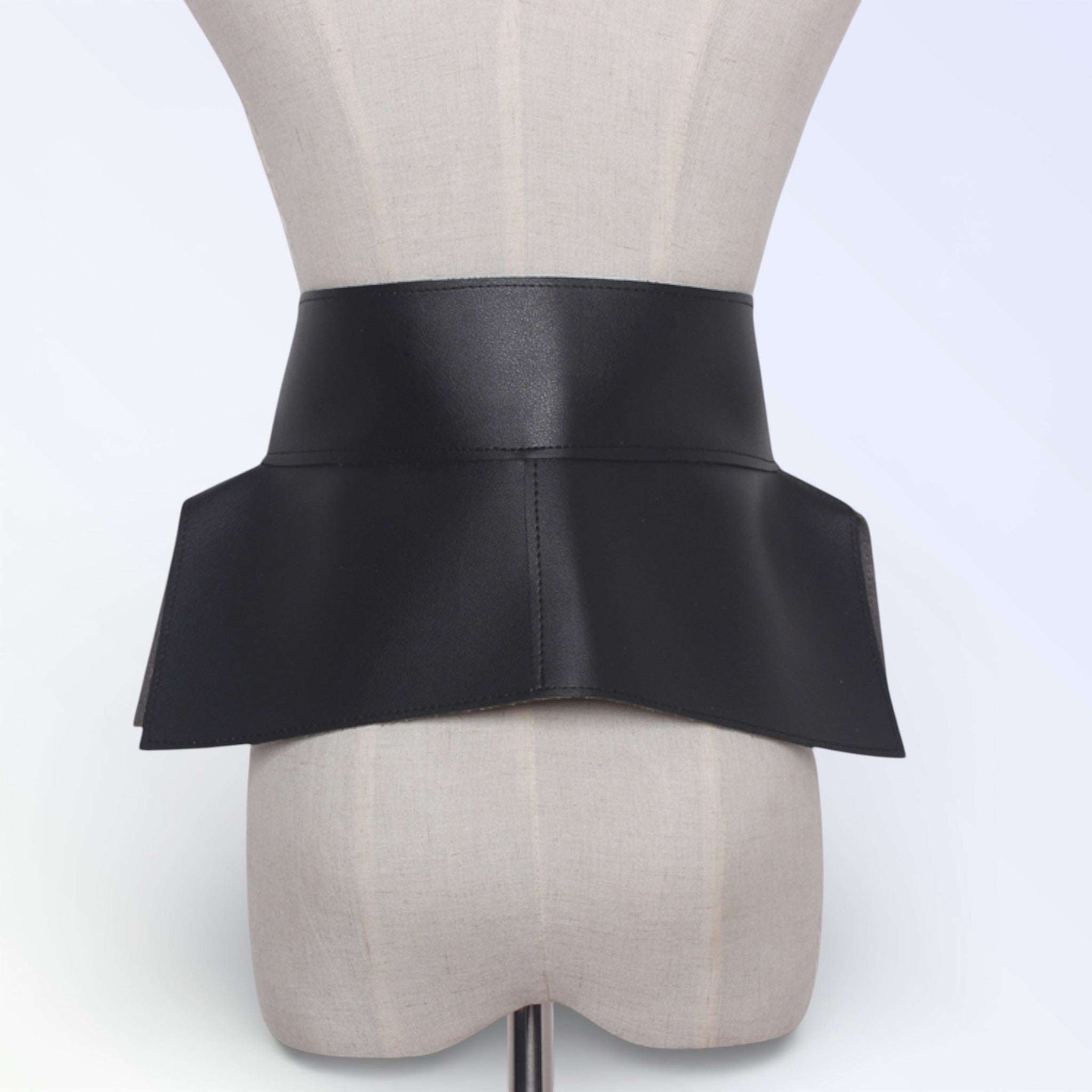 Cinto largo em preto, de efeito pele, que marca a cintura e cria uma silhueta elegante e bem definida.