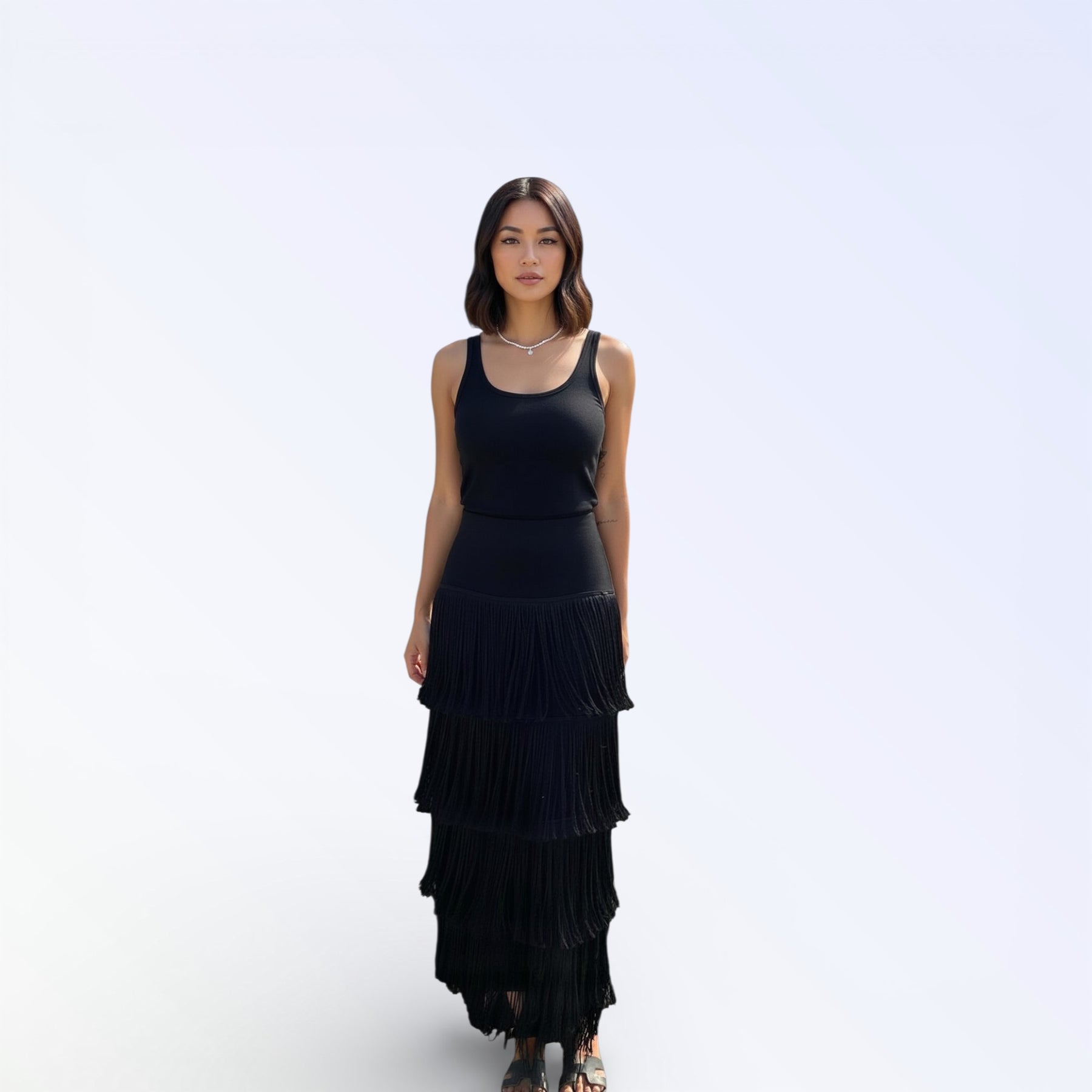 Elegancia premium en punto con delicados flecos. Un vestido que combina tradición y modernidad.