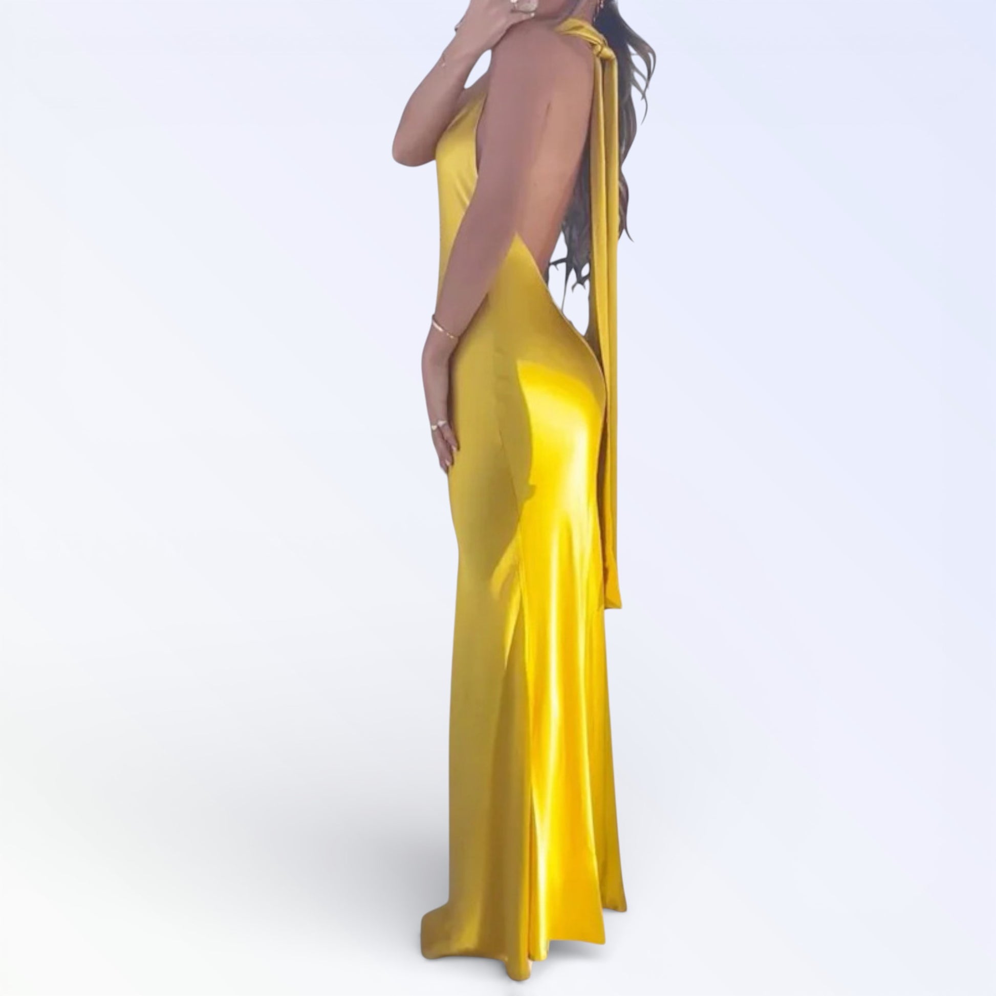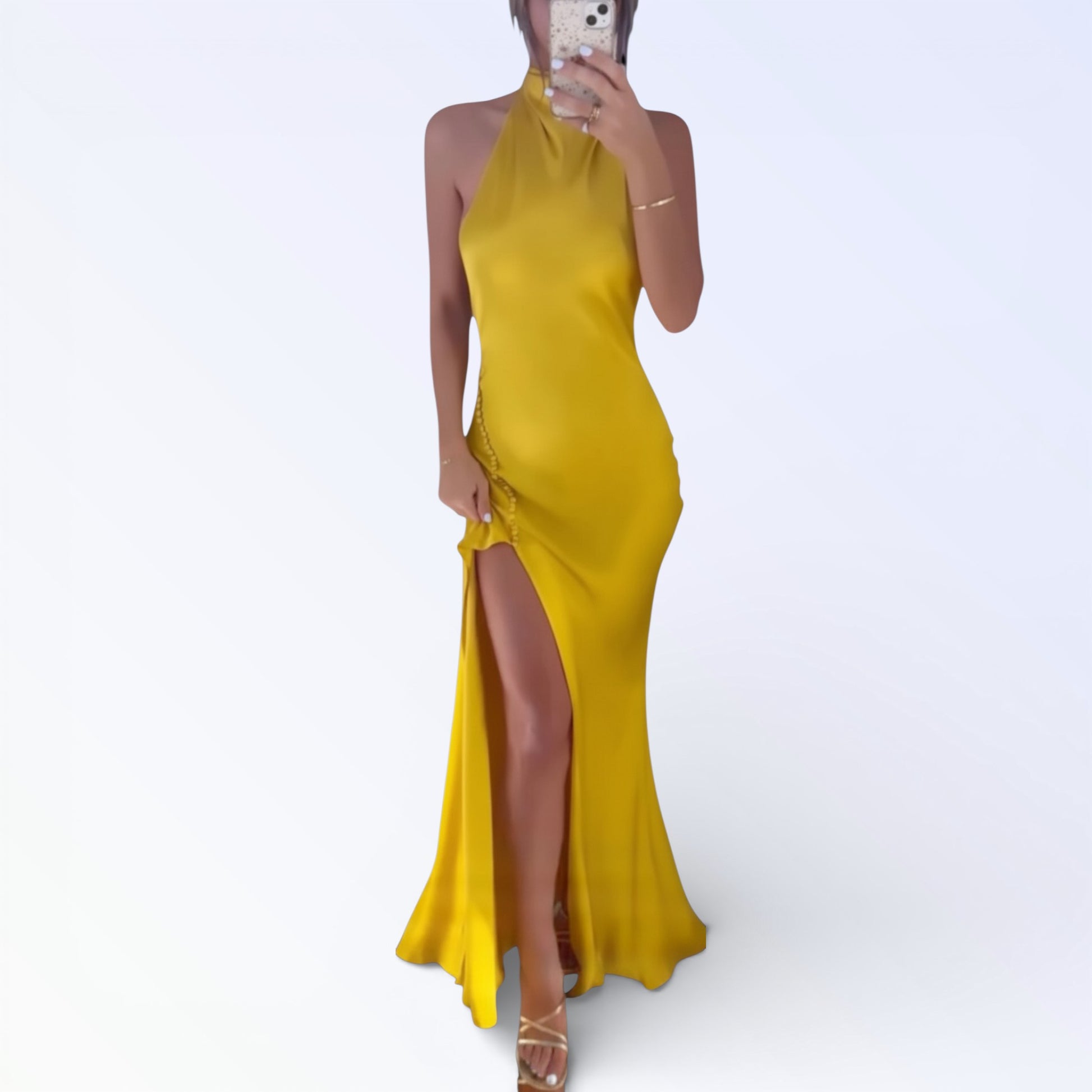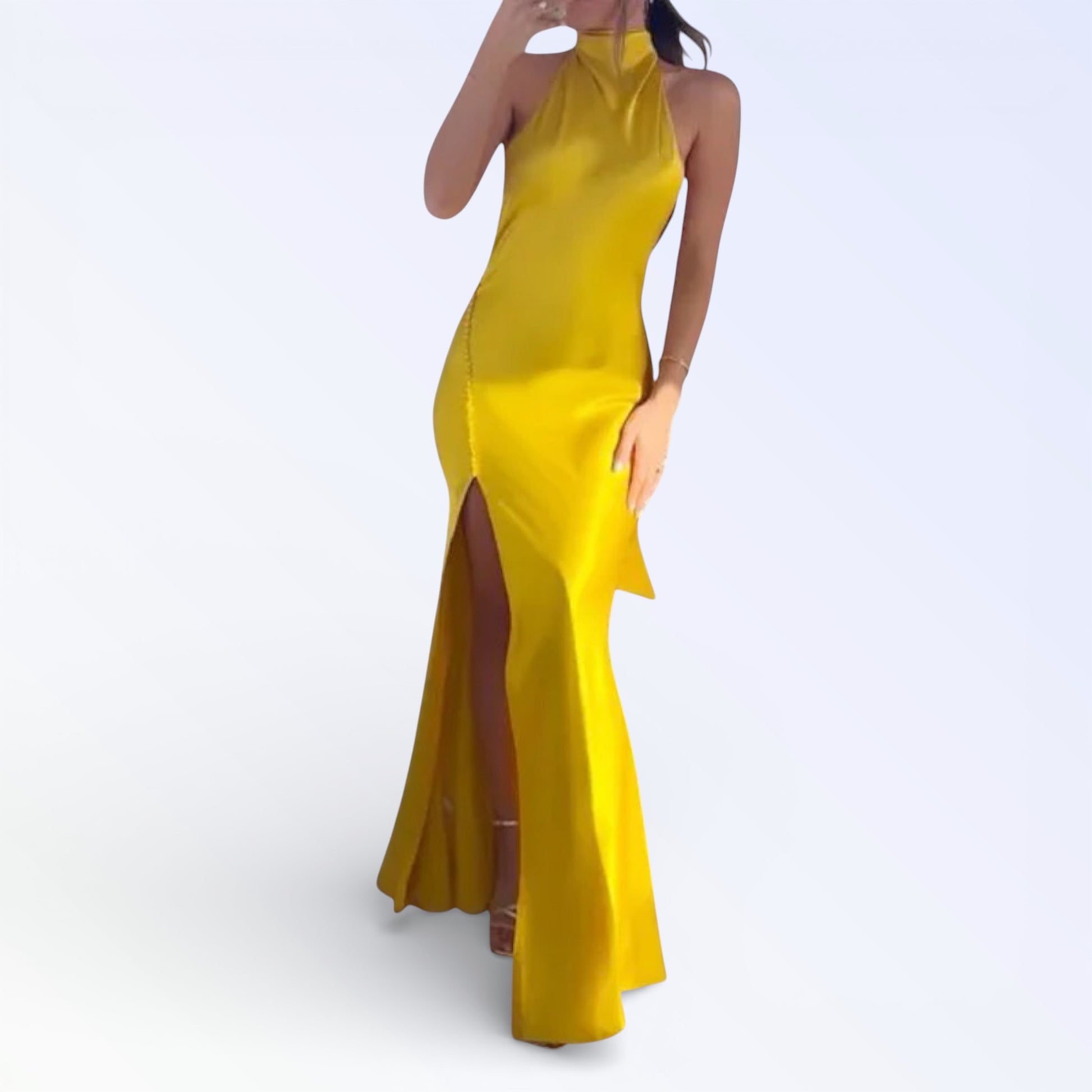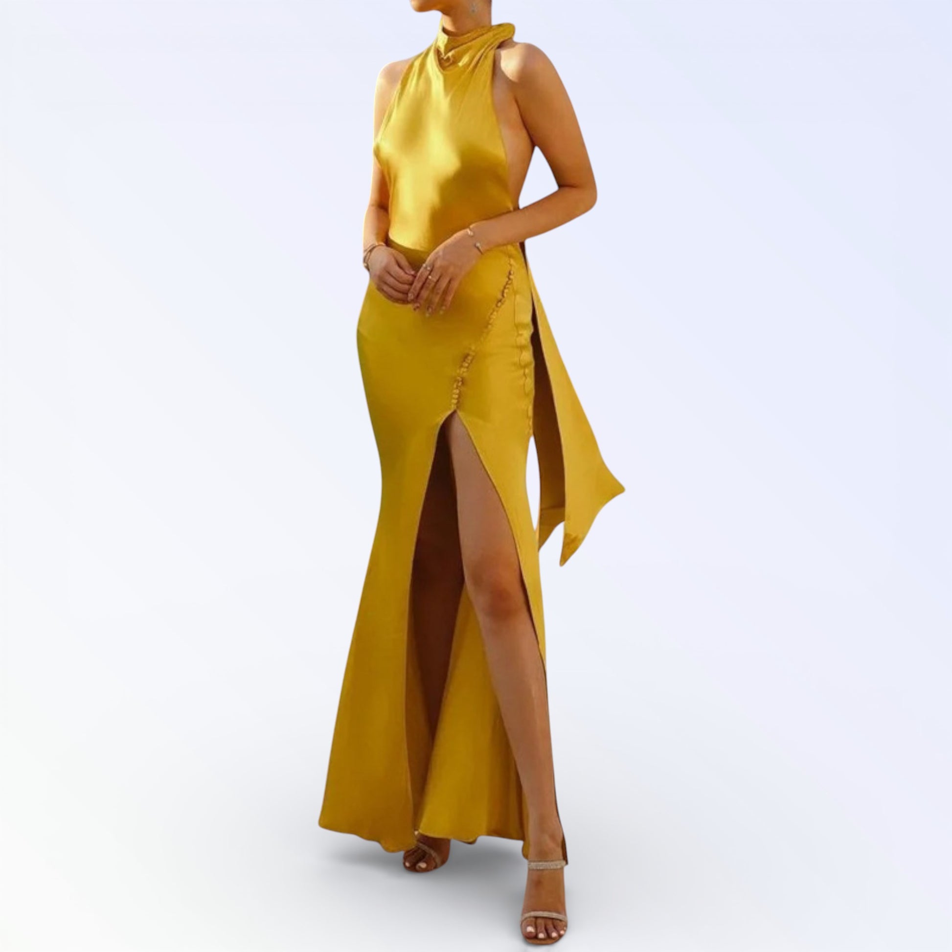 El vestido BOURBON de satén largo combina un escote halter alto con una espectacular abertura frontal y una espalda descubierta que revela con clase. Con un corte sirena que realza la figura, es la elección ideal para galas, bodas o noches especiales en las que quieras deslumbrar.
