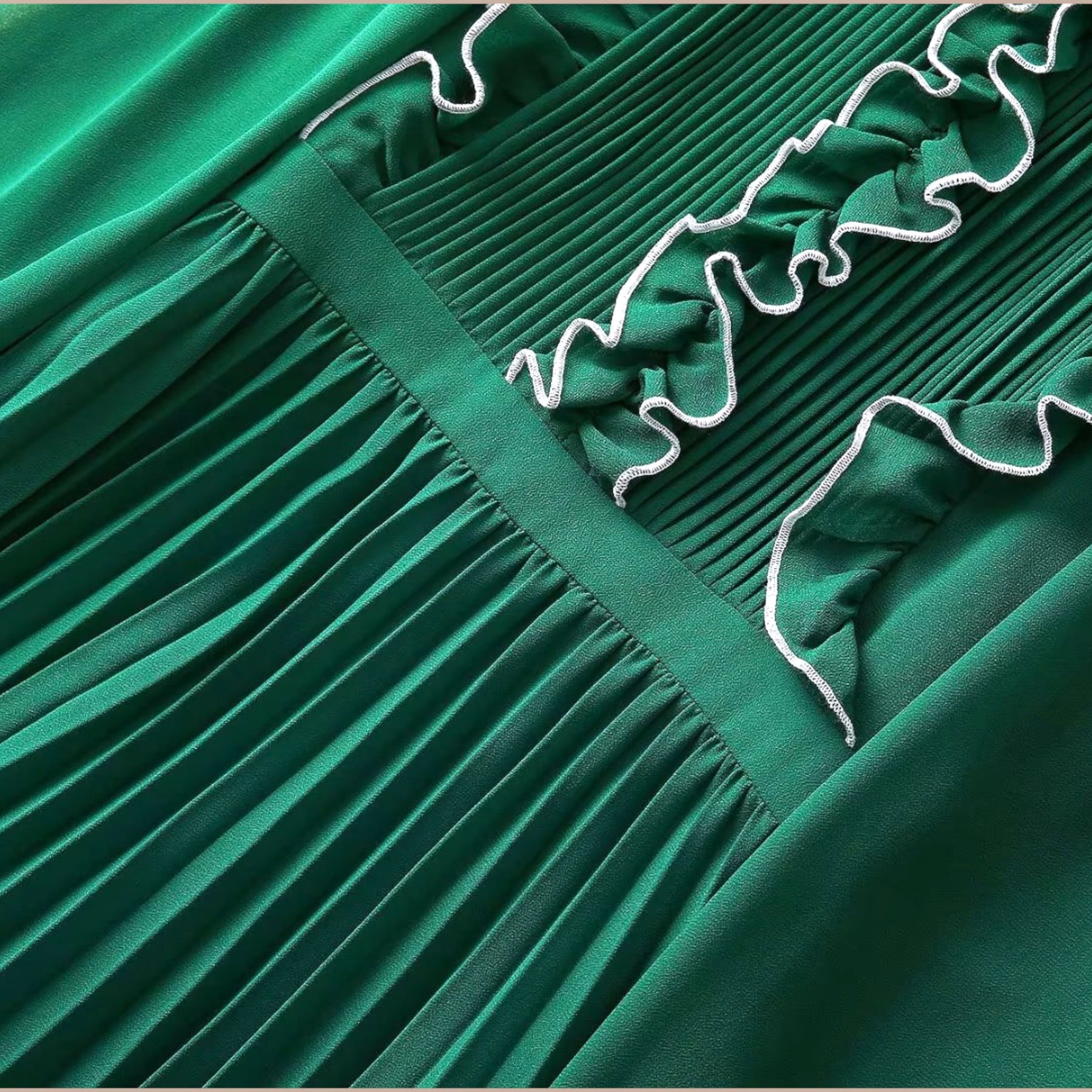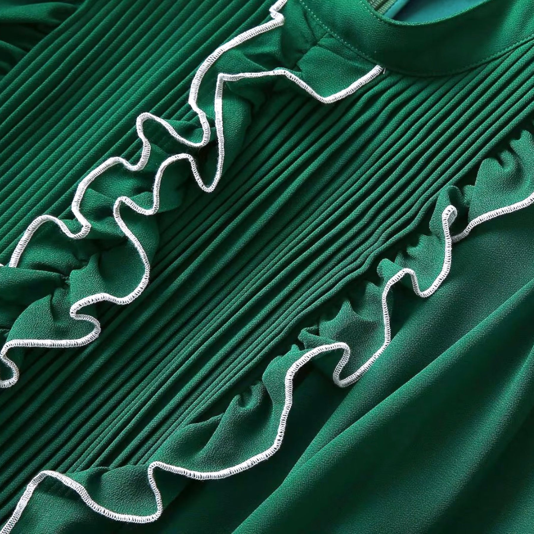 Elegancia exquisita en tela esmeralda de primera calidad. Un diseño con volantes que combina tradición y modernidad.