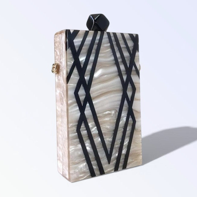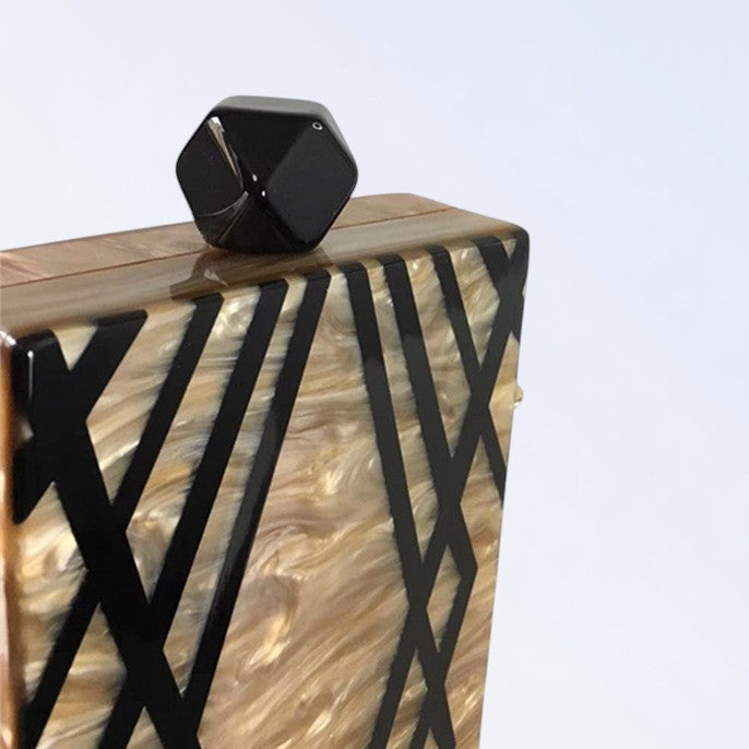 Madre-pérola rectangular linhas pretas geométricas, puxador preto quadrado, corrente ouro fina.