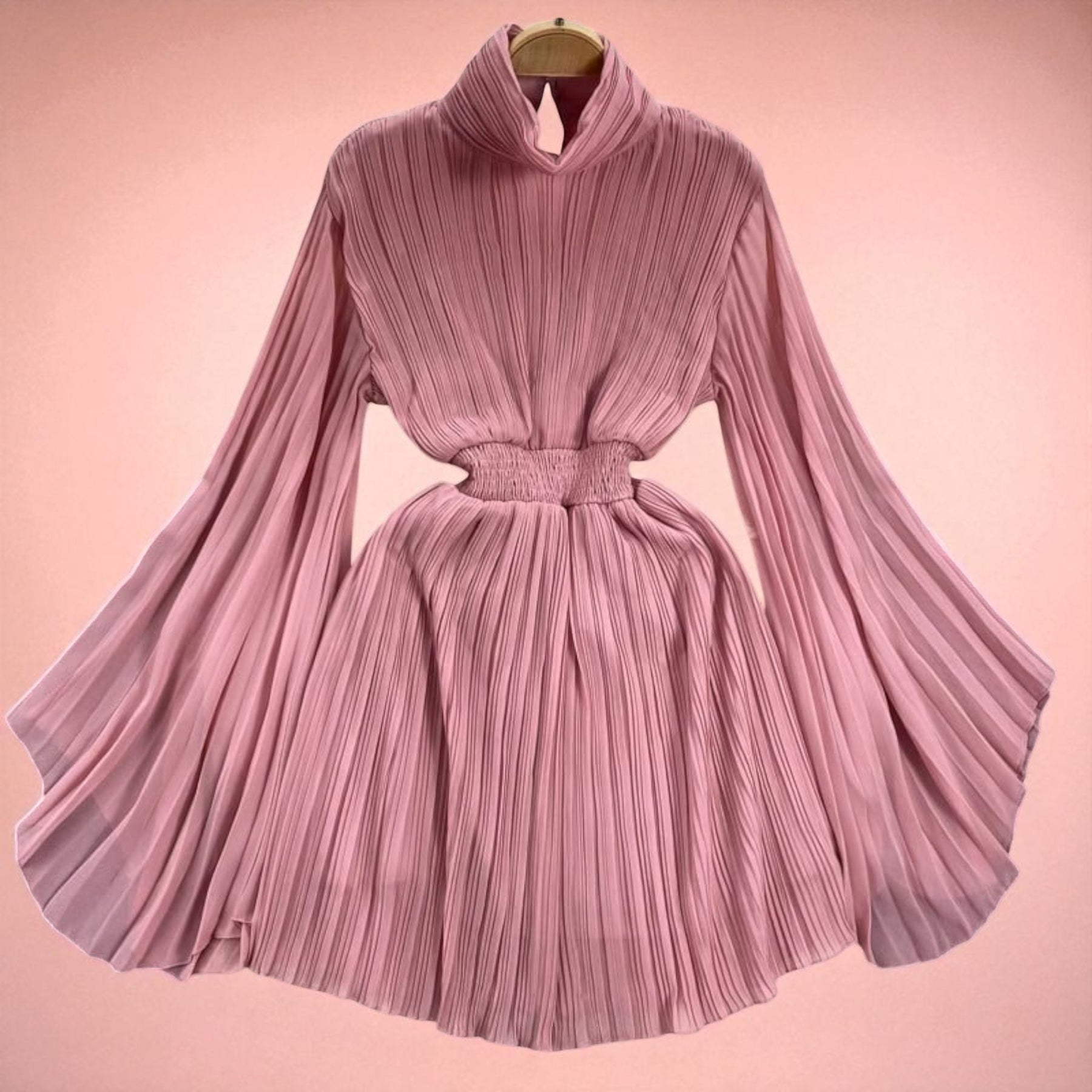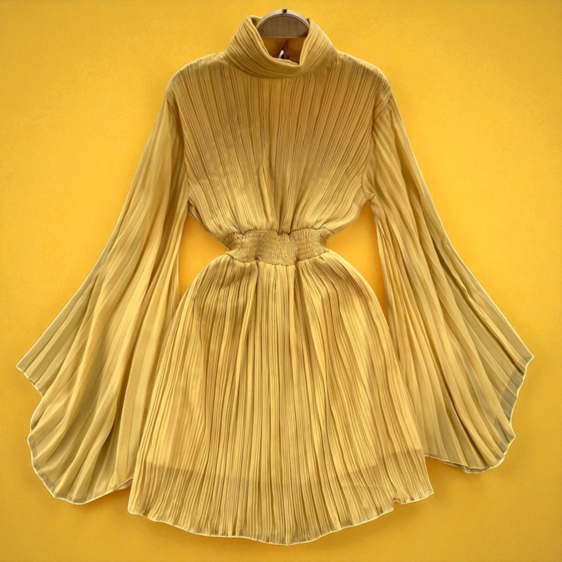 Elegancia italiana en cada detalle. Sofisticado diseño de cuello alto con mangas plisadas que combina tradición y modernidad.