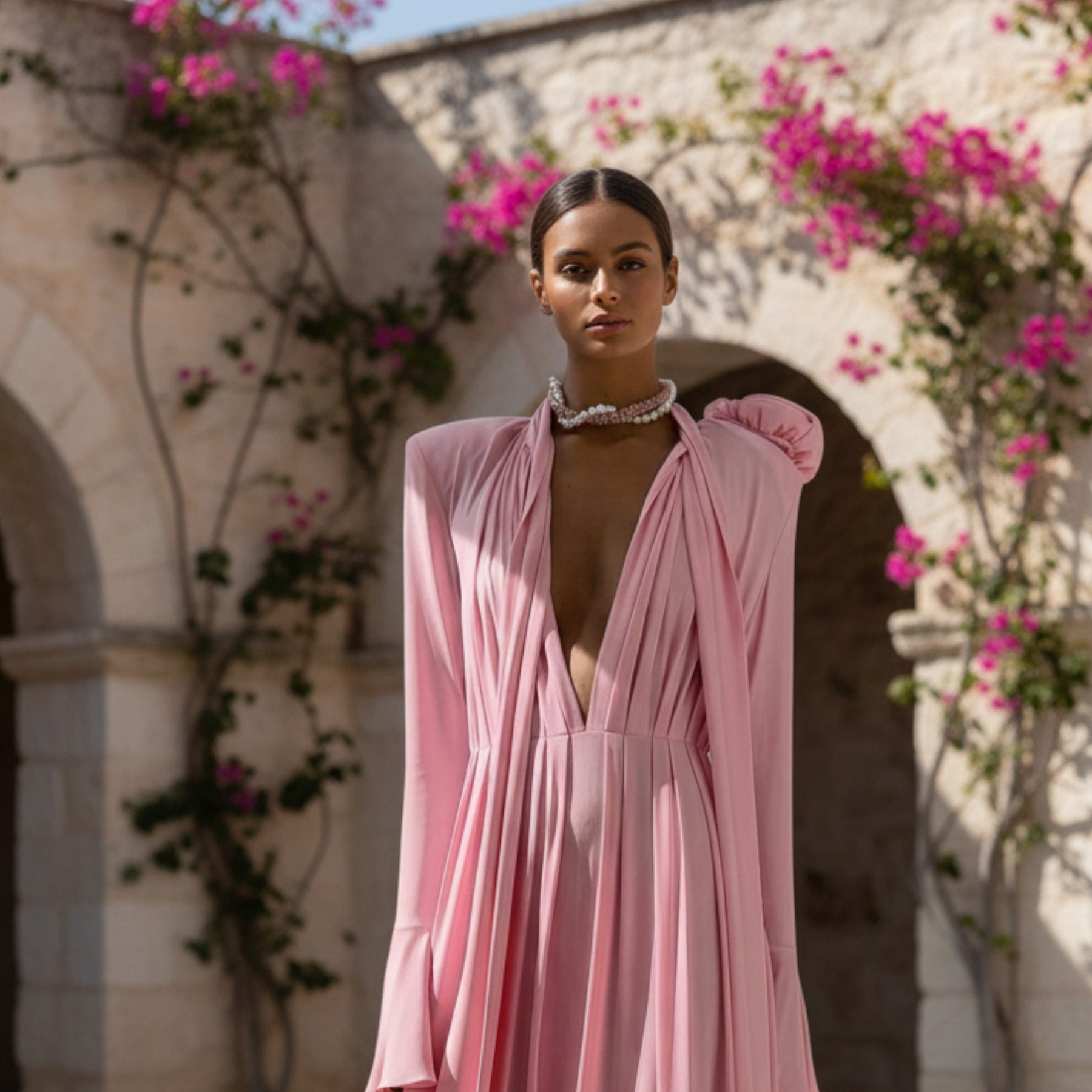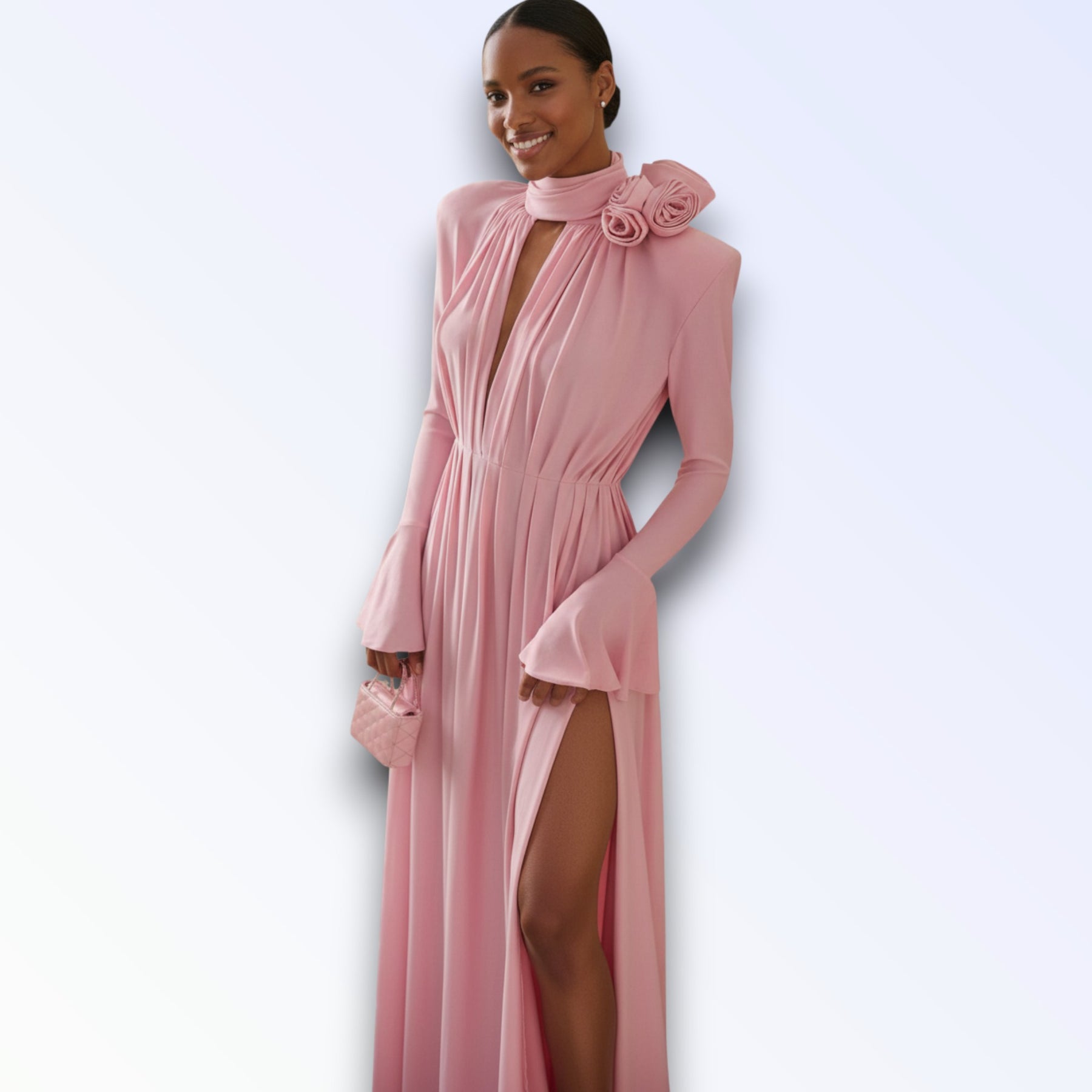 O D. MARIA envolve com drapeado fluido que cai em ondas escultóricas do pescoço aos pés, ombros altos estruturados criam presença imponente e laço no pescoço adiciona toque romântico. Mangas longas amplas dão movimento aéreo, silhueta coluna alongada perfeita para galas ou eventos formais da KUKA. Leveza premium une drama a elegância atemporal.